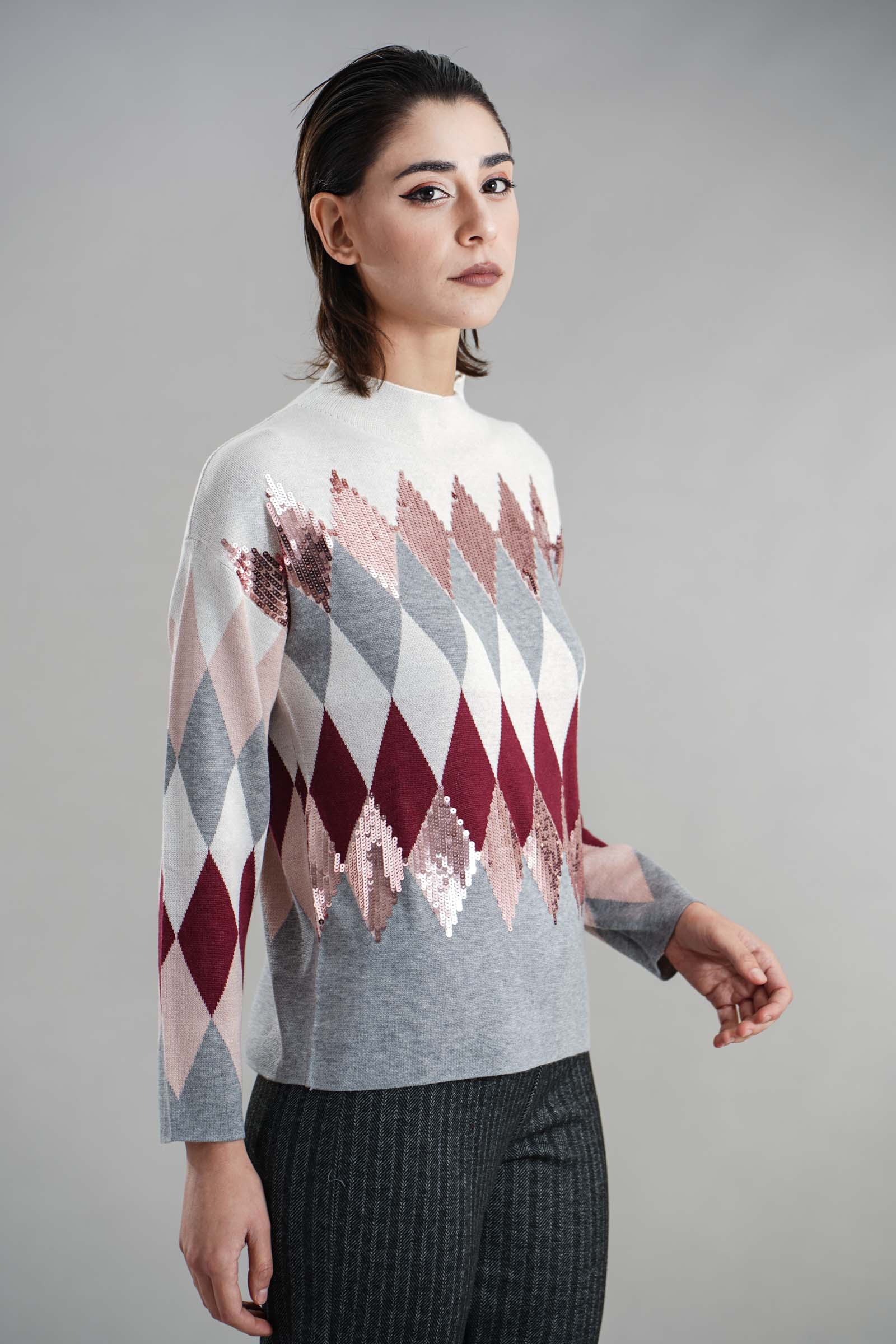 Vestibilita' regolare. Girocollo. Dettaglio di pailettes applicati. Altezza modella 1,82. Nella foto indossa la taglia S. Composizione: 44% Poliestere, 30% Acrilico, 20% Poliammide, 6% Lana. Brand: Z.O.E