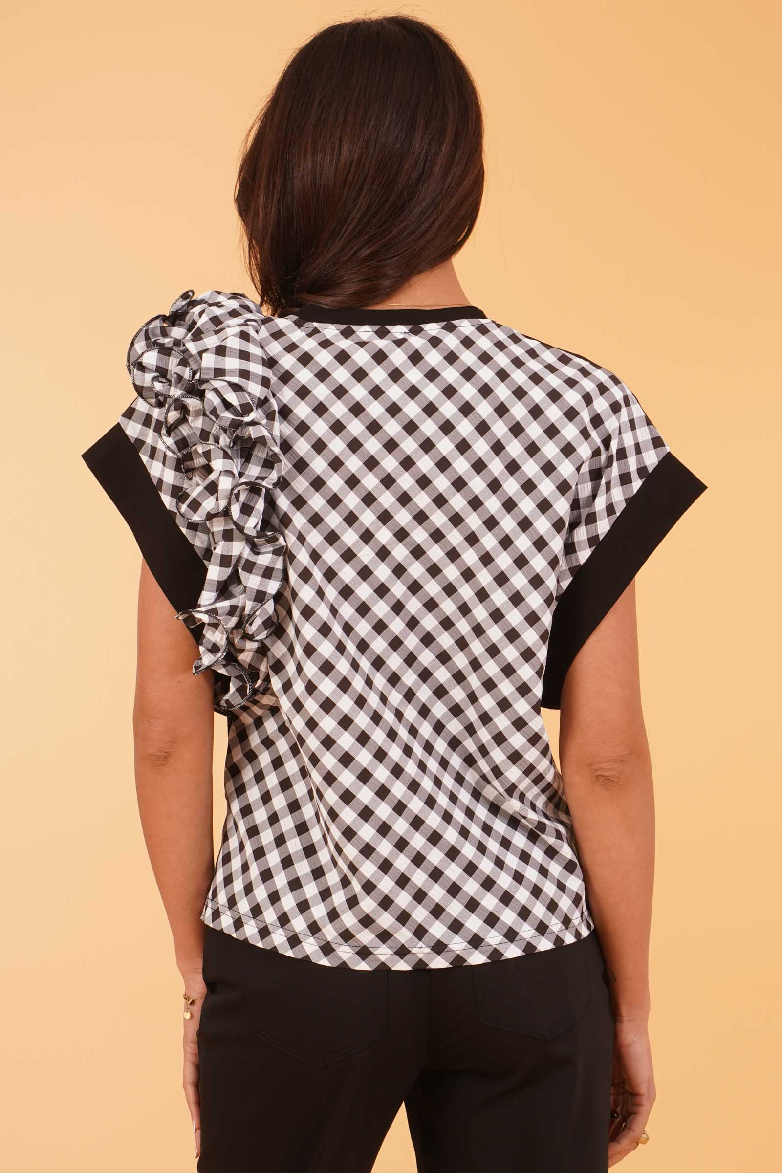 Vestibilita' comoda. Scollo a V Pannello posteriore piu' rouches a quadri bianco e nero. Altezza modella 1,80. Indossa la taglia S. Composizione: 92% Cotone, 8% Elasytane. Brand: Z.O.E.