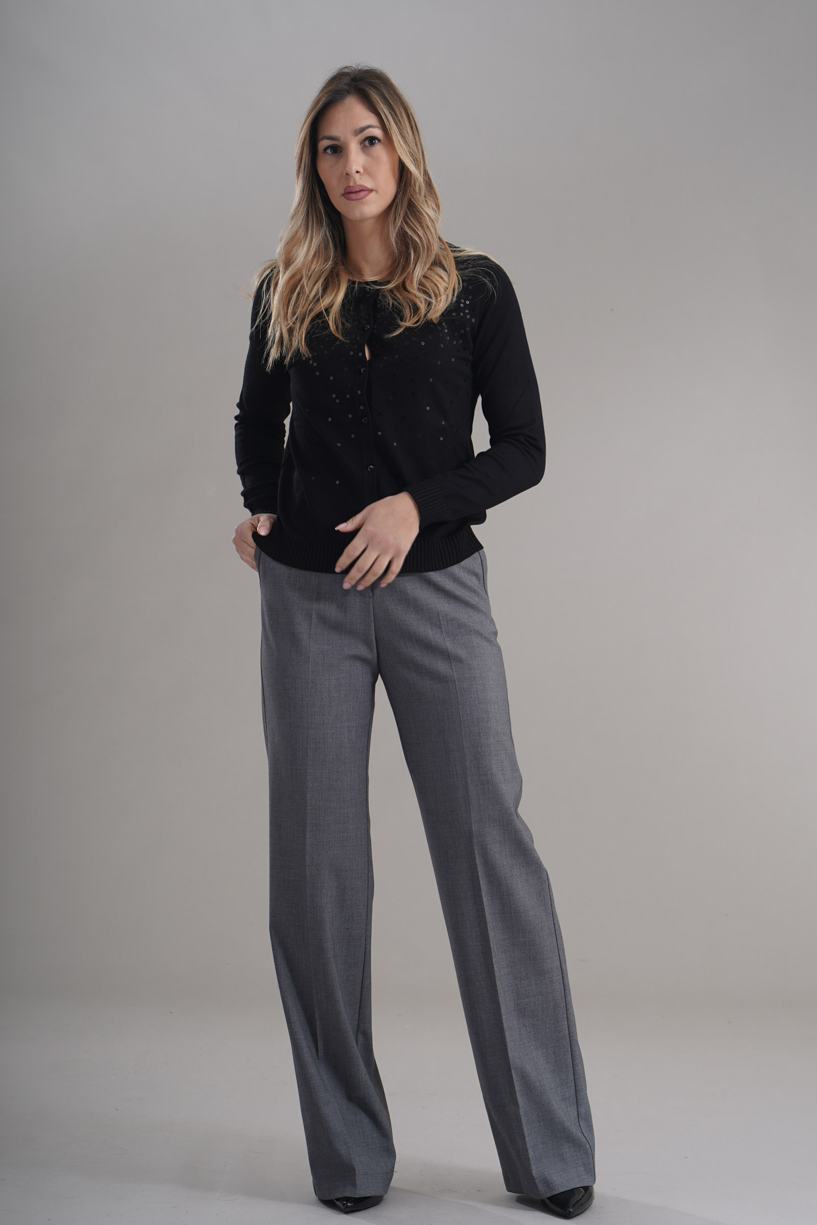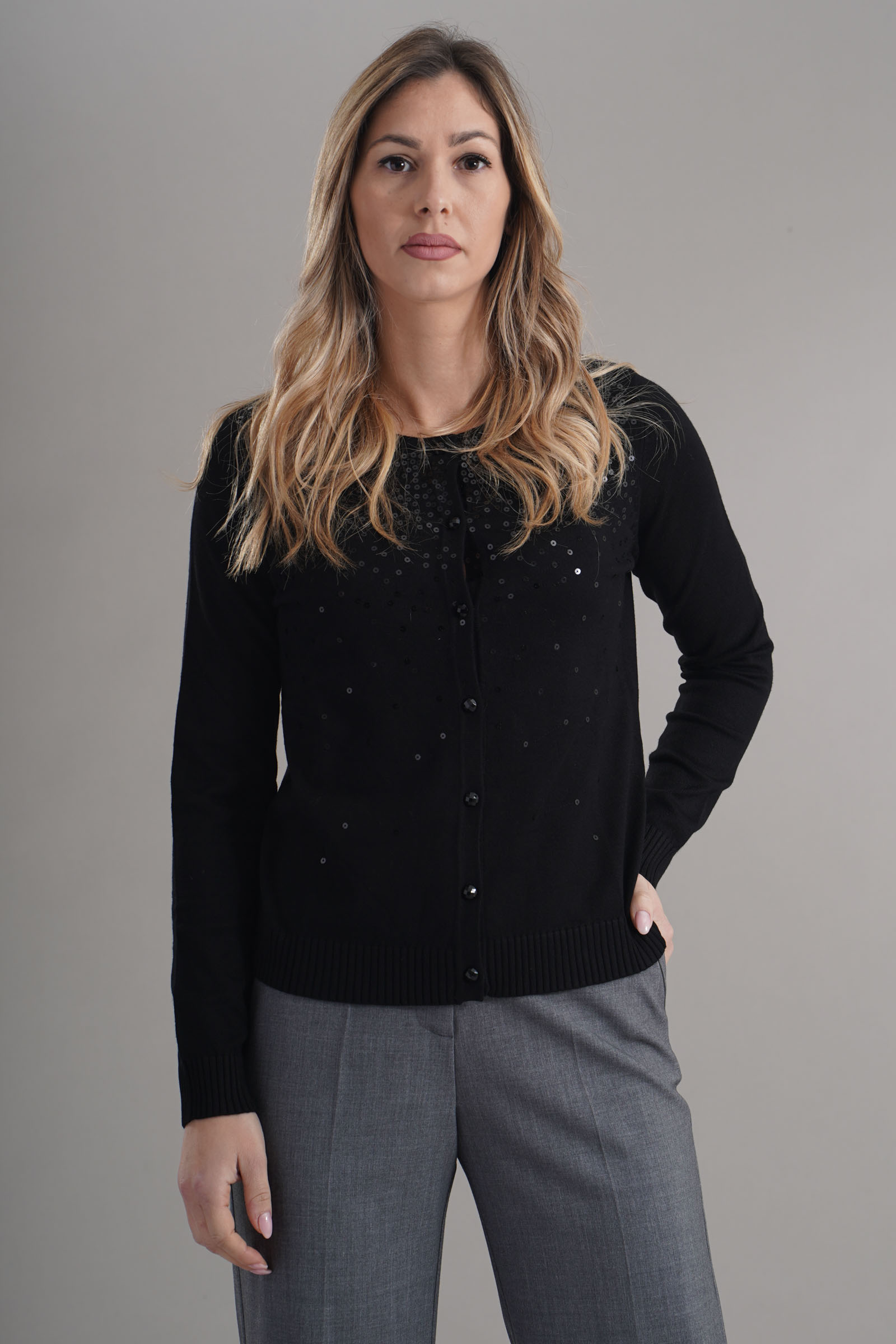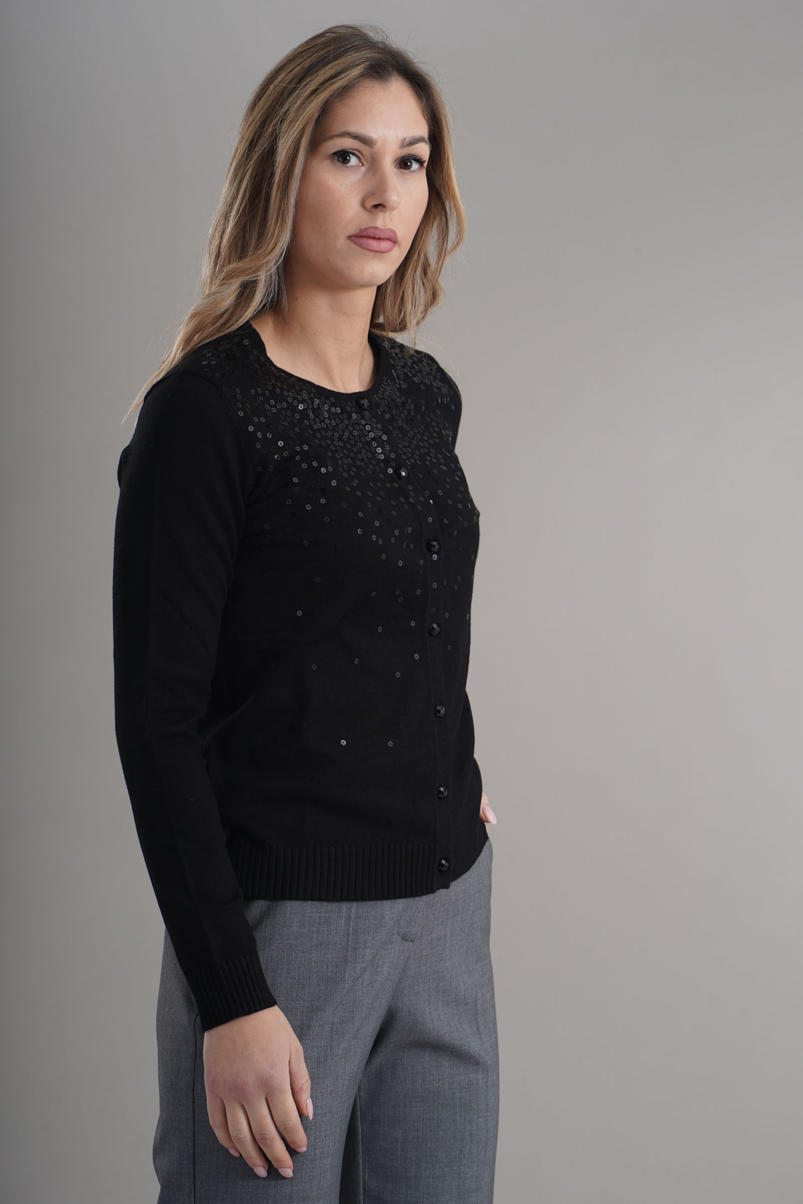 Vestibilita' regolare. Chiusura con bottoni. Dettaglio di micropaillettes applicati. Altezza modella 1,79. Nella foto indossa la taglia S. Composizione: 70% Viscosa, 30% Poliammide. Brand: Z.O.E
