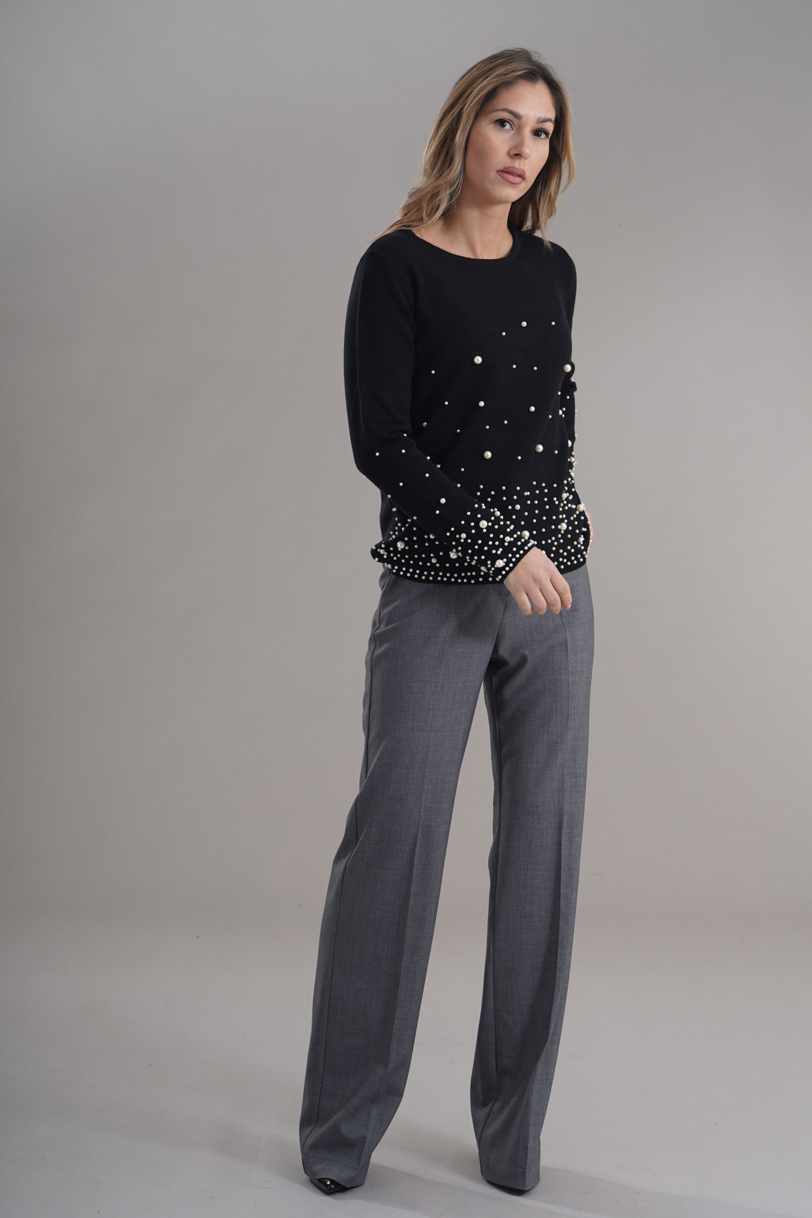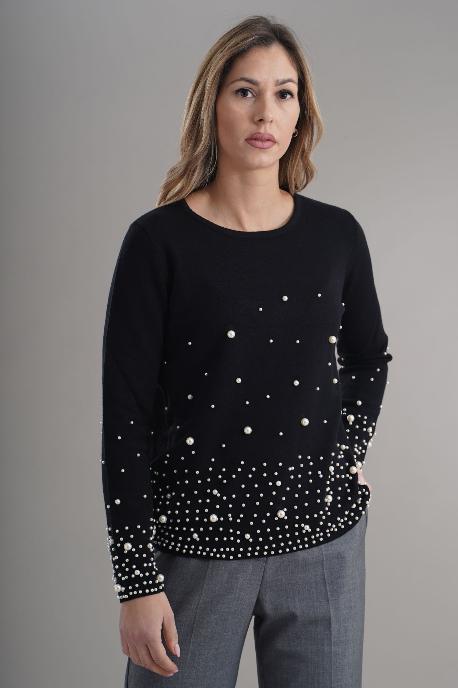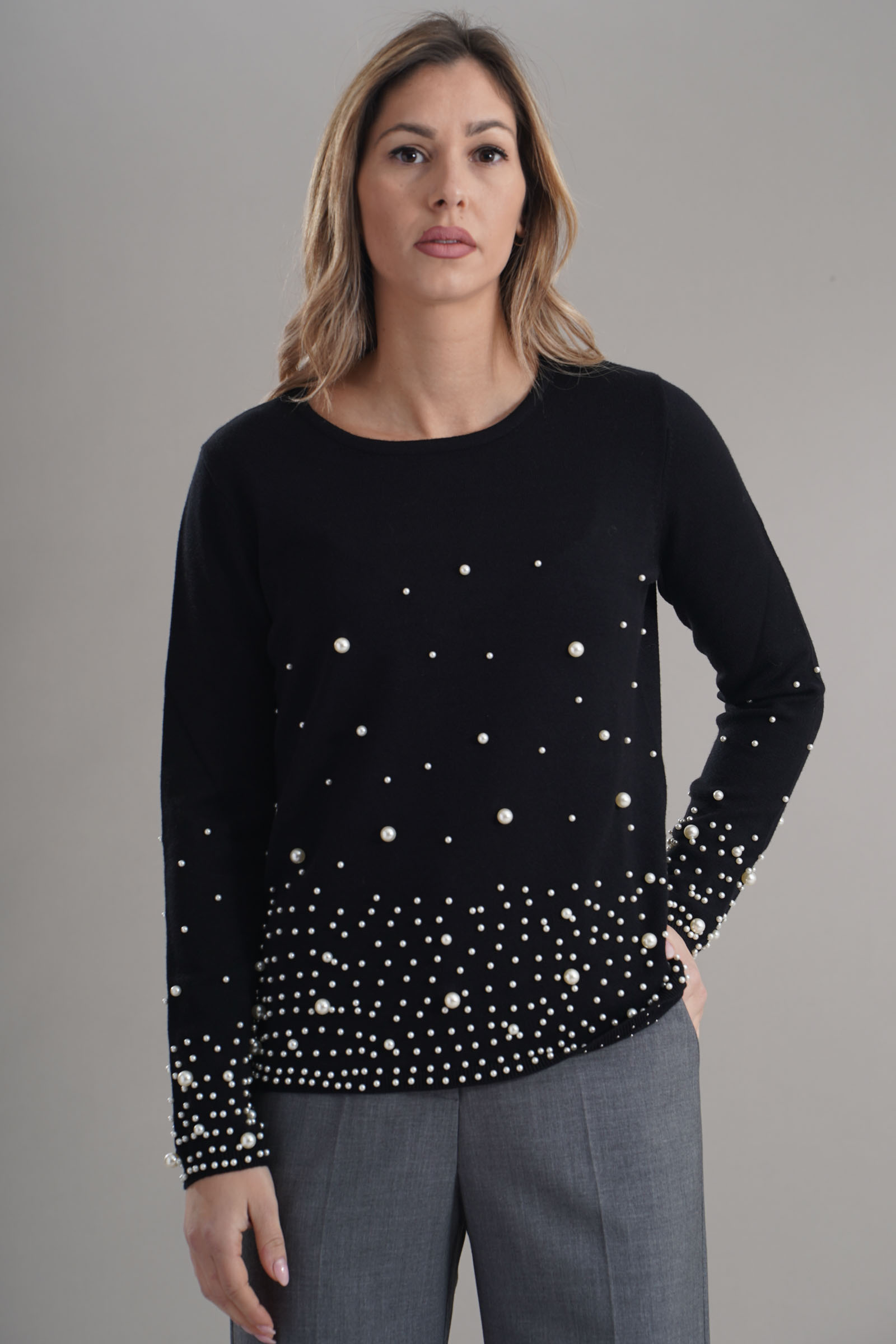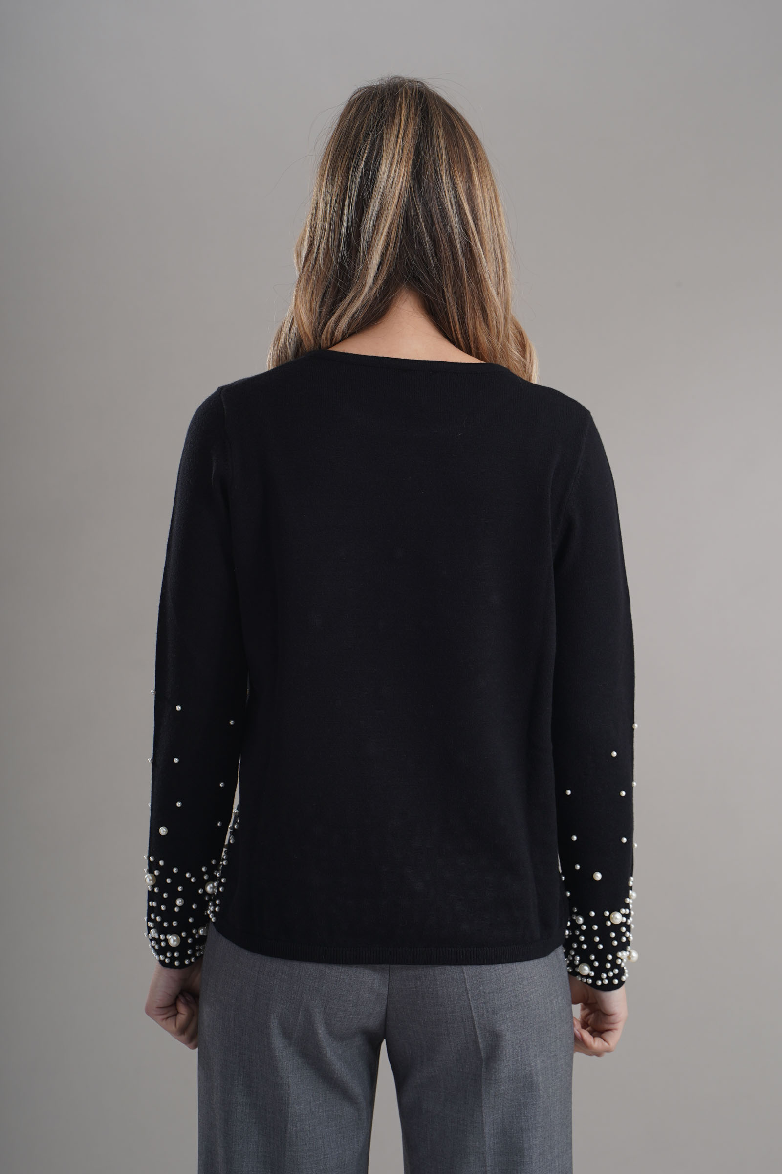 Vestibilita' regolare. Girocollo. Dettaglio di perle applicate. Altezza modella 1,79. Nella foto indossa la taglia S. Composizione: 50% Viscosa, 28% Poliammide, 22% Poliestere. Brand: Z.O.E